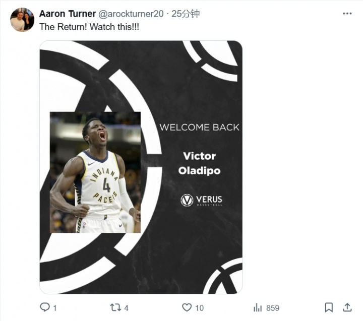 Đại lý của Kumingga Aaron Turner đã cập nhật Twitter của mình 25 phút trước, đăng một poster Oladipo mặc áo pacers, với văn bản: "Quay lại!